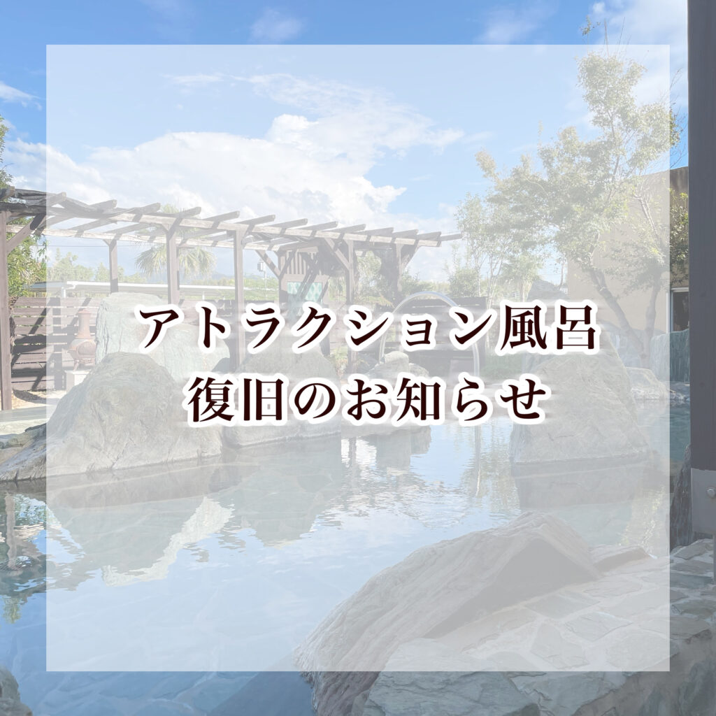2025.9.24 お知らせ 【再開】アトラクション風呂復旧のお知らせ 日頃より最高の湯をご利用いただき誠にありがとうございます。 機材トラブルにより利用を停止しておりました 男女アトラクション風呂の利用を再開しましたことをお知らせ致します。 ご滞在中はお時間の許す限りごゆっくりとお過ごしくださいませ。 スタッフ一同お客様のご来館を心よりお待ち致しております。